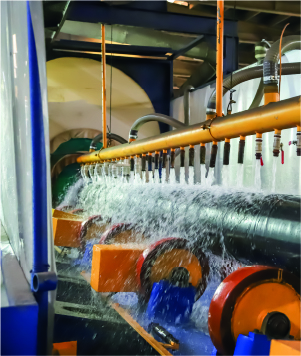 The pipe is heated up to 180-220°C by a gas oven or induction cabin, and the surface of the pipe is electrostatically coated with special epoxy guns between 100-200 microns. The adhesive layer is obtained by the extrusion method and bonded to the pipe surface via silicone rollers. The polyethylene obtained by the same extrusion method is wrapped similarly. The polyethylene-coated pipe is cooled to 50-70°C in the cooling tunnel.